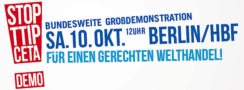 Mit einer bundesweiten Großdemonstration soll am 10. Oktober in Berlin ein kraftvolles Zeichen gesetzt werden. Wir werden deutlich machen, dass gesellschaftliche Errungenschaften wie Umweltschutz, Verbraucherschutz und ArbeitnehmerInnenrechte unverhandelbar sind. Auch eine nachhaltige, bäuerliche Landwirtschaft und die kulturelle Vielfalt sind Werte, die es zu schützen und auszubauen gilt.