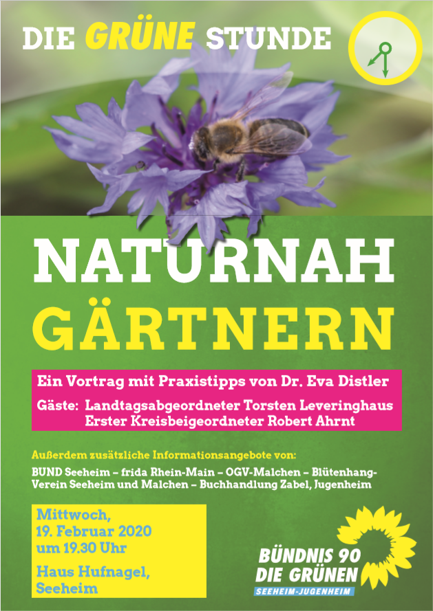 Der Frühling naht und mit ihm die Gartenarbeit für viele Seeheim-Jugenheimer*innen. Wer rund ums Haus lieber auf blühende Vielfalt statt auf vermeintlich pflegeleichte Schottergärten setzt, erhält wertvolle Anregungen in der Informationsveranstaltung von Bündnis 90/Die GRÜNEN Seeheim-Jugenheim am 19. Februar um 19:30 Uhr im Haus Hufnagel.