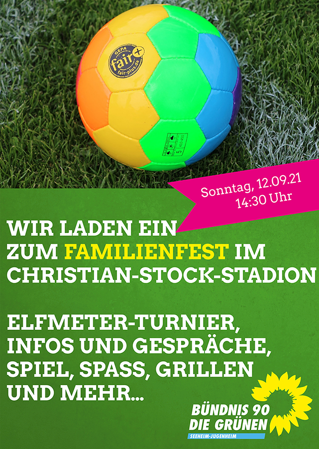 Bündnis 90/DIE GRÜNEN Seeheim-Jugenheim laden herzlich zum Familienfest ein am Sonntag, 12. September 2021 ab 14.30 Uhr im Christian-Stock-Stadion.