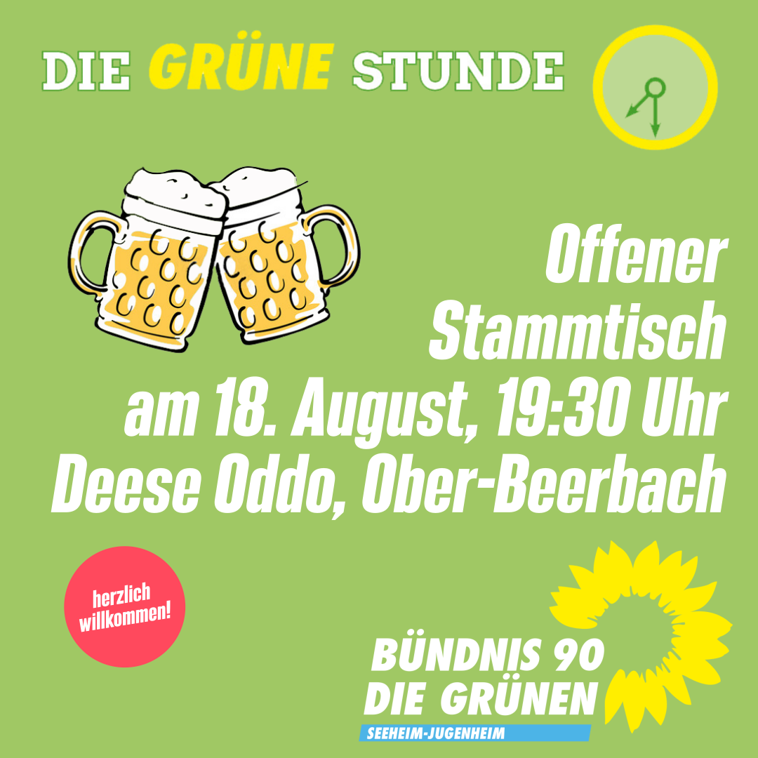 Der Ortsverband Bündnis 90/DIE GRÜNEN Seeheim-Jugenheim freut sich auf ein Treffen mit vielen Mitbürger*innen beim nächsten „Stammtisch“ in Ober-Beerbach.